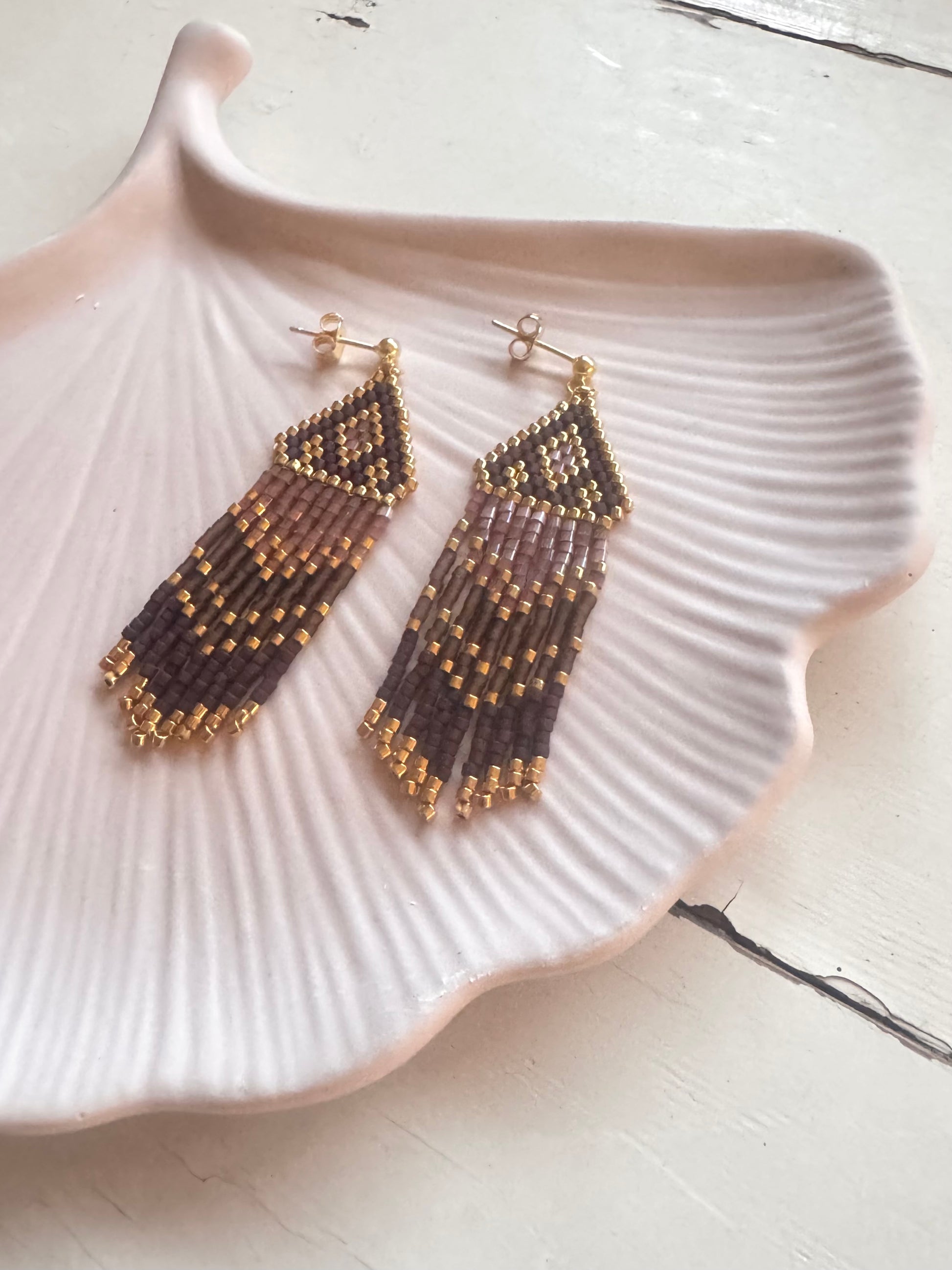 Ørestikker i 18 karat forgyldt sterlingsølv med boheme øreringe syet med Miyuki Delica perler i brune & gyldne toner.