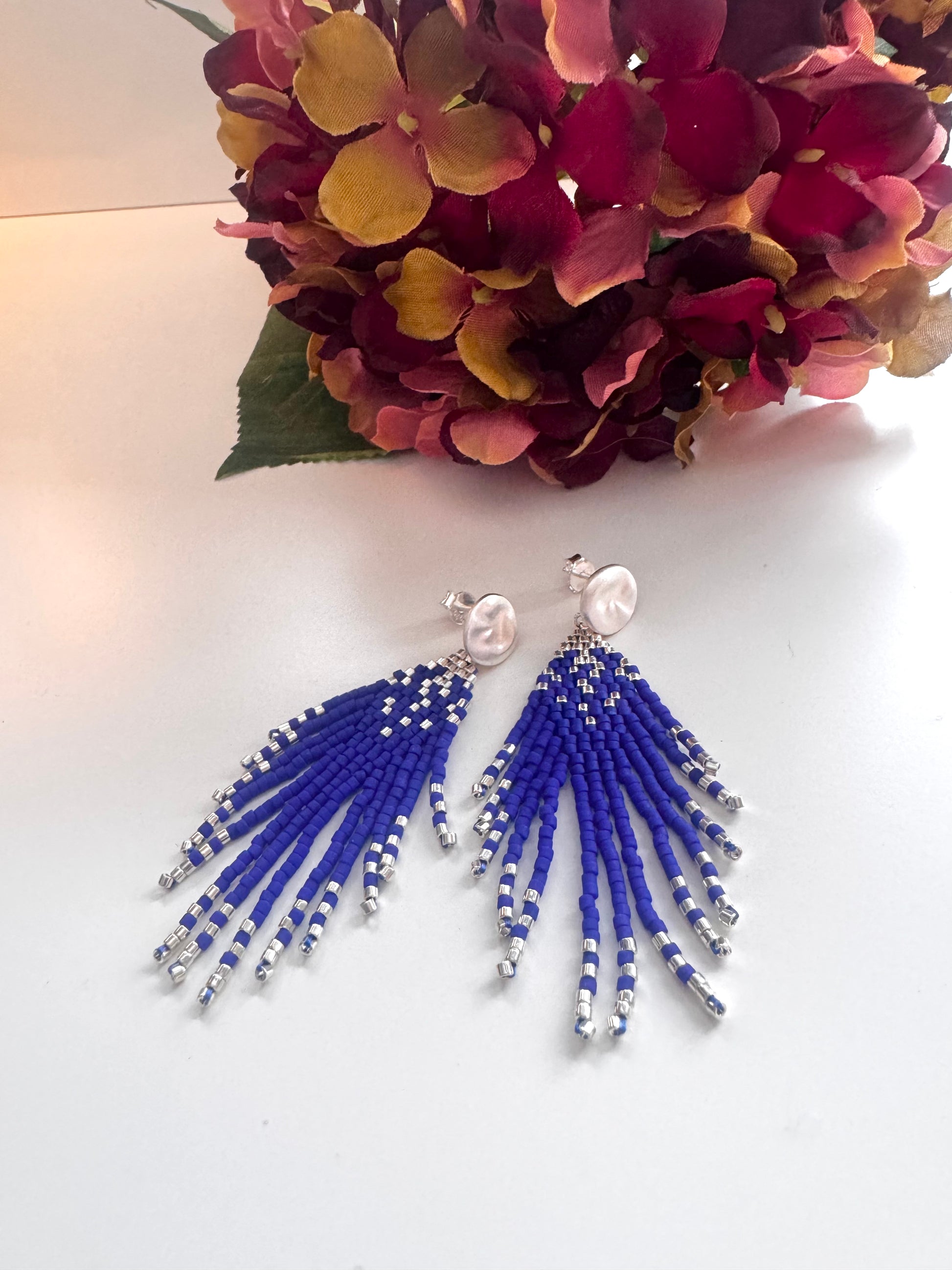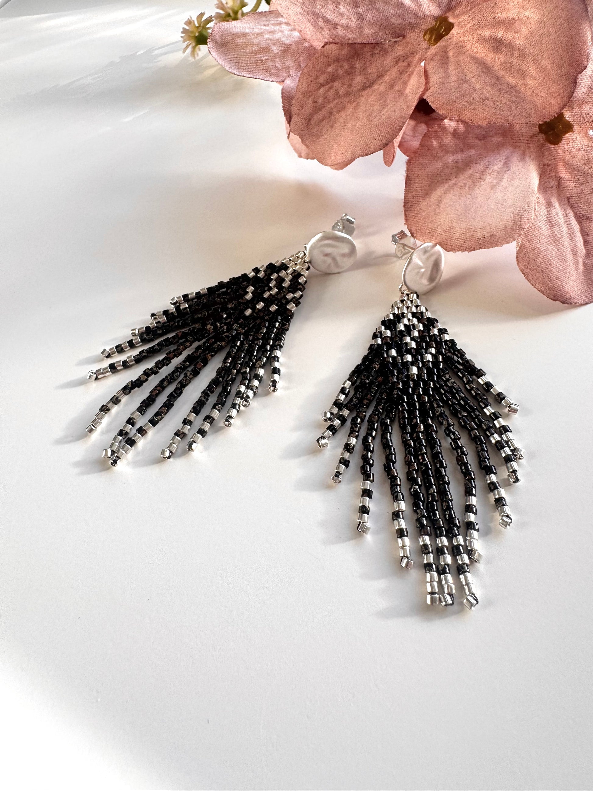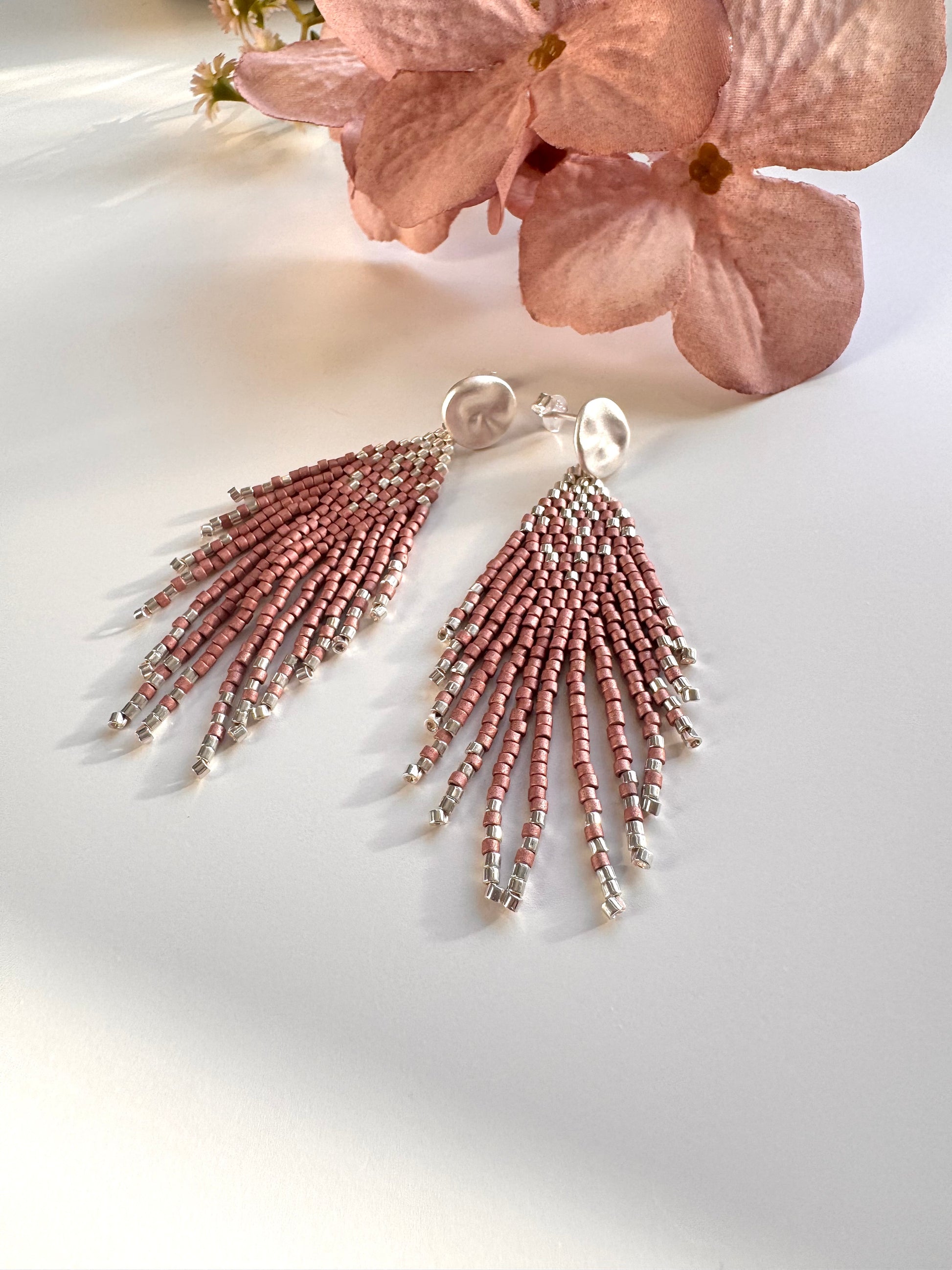 Fringe øreringe håndsyede af Miyuki Delica perler & Miyuki Delica perler belagt med sterlingsølv på ørestikker i sterlingsølv.