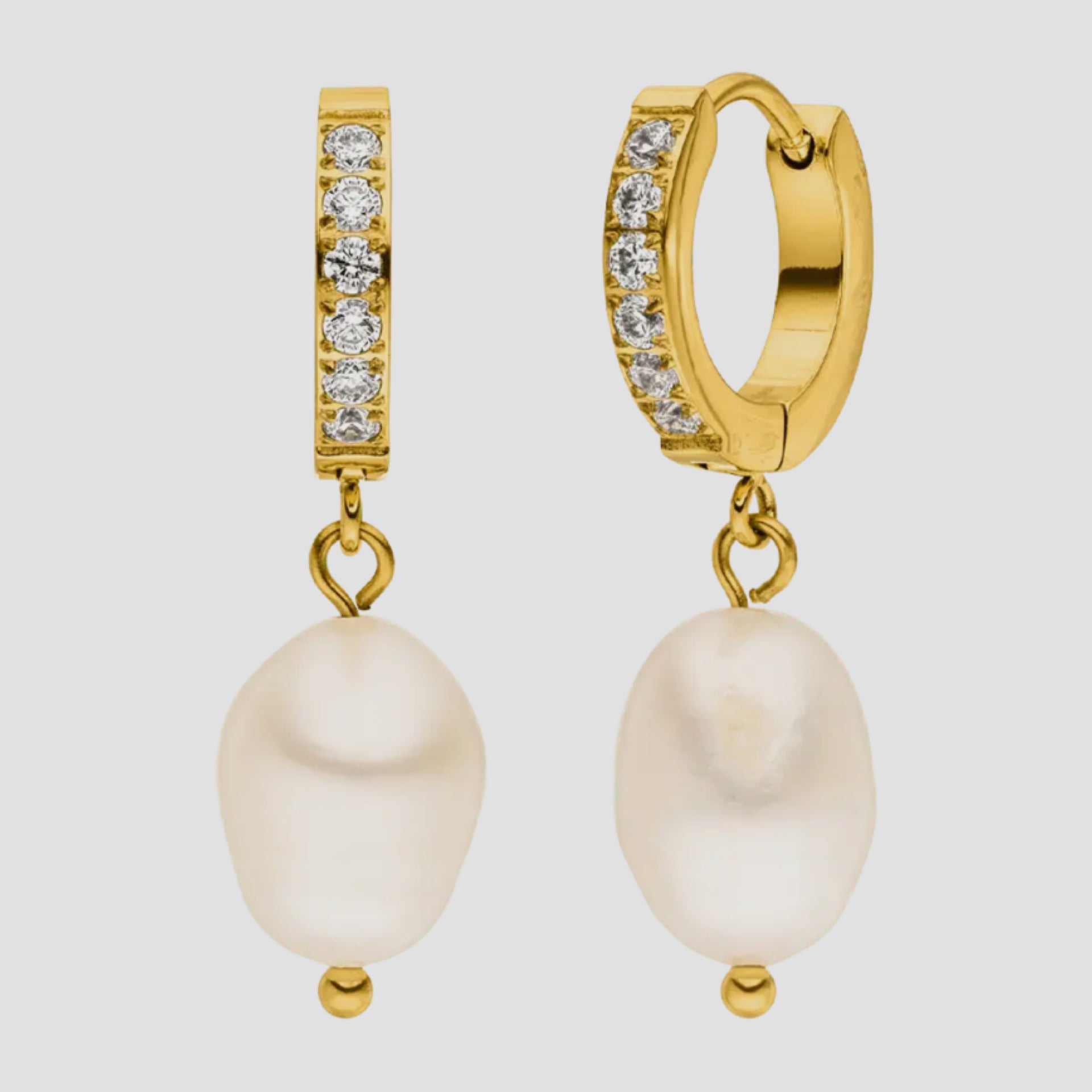 Disse øreringe er dekoreret med ferskvandsperlevedhæng og mousserende zirkoniumsten. Perlesmykker gør i øjeblikket comeback.